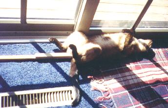 Kiwi the Mid-Centurian family pet in her "cat-on-a-skewer" pose.